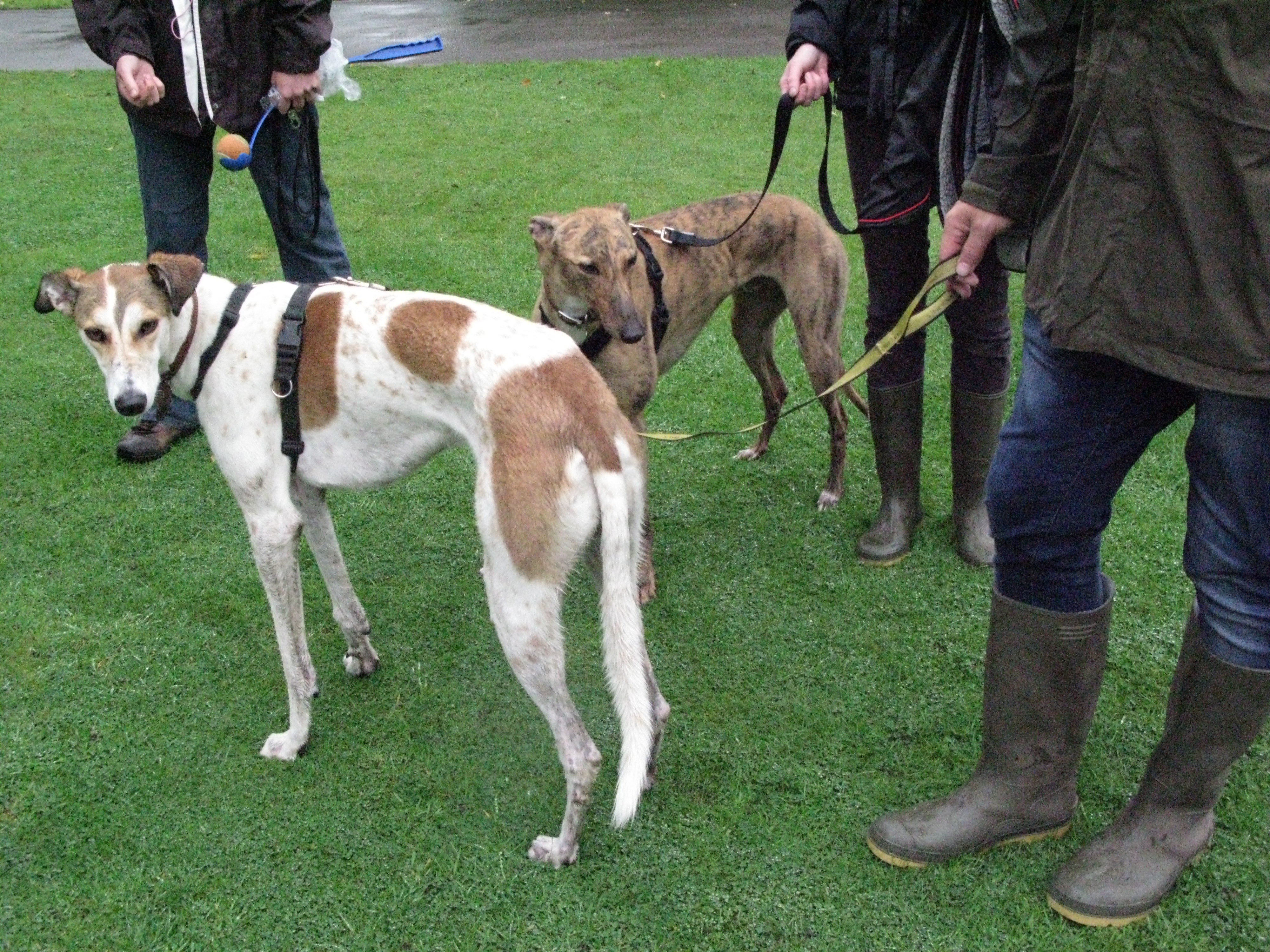 This morning we reach what we dog walkers call ‘down the bottom’ in Kings Heath Park. It’s the old bowling green now used for dog gatherings, football, impromptu end of term celebrations and T’ai Chi classes. Today Conchobhar, the doodles and Cookie have been joined by a pup and by Gilbert and George the svelte rescued greyhounds.
