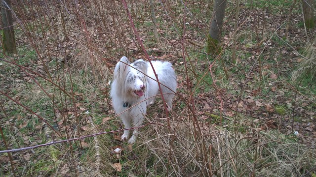When they find us, Isis has already danced among her fir trees and enjoyed a good sniff around the bench by the little beech wood, so she’s happy to set off in another direction on her extending lead.