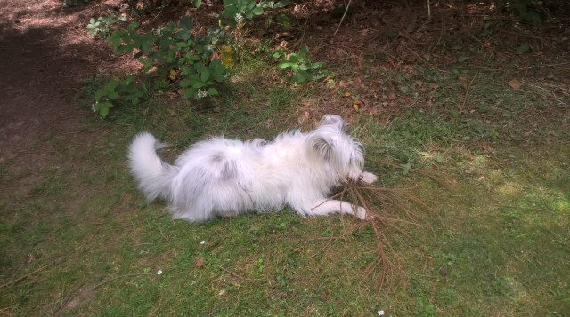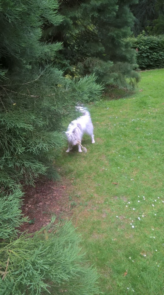 Don’t know what the fuss is about, but not to worry, I soon find another big stick. One I had a good chew on only the other day.