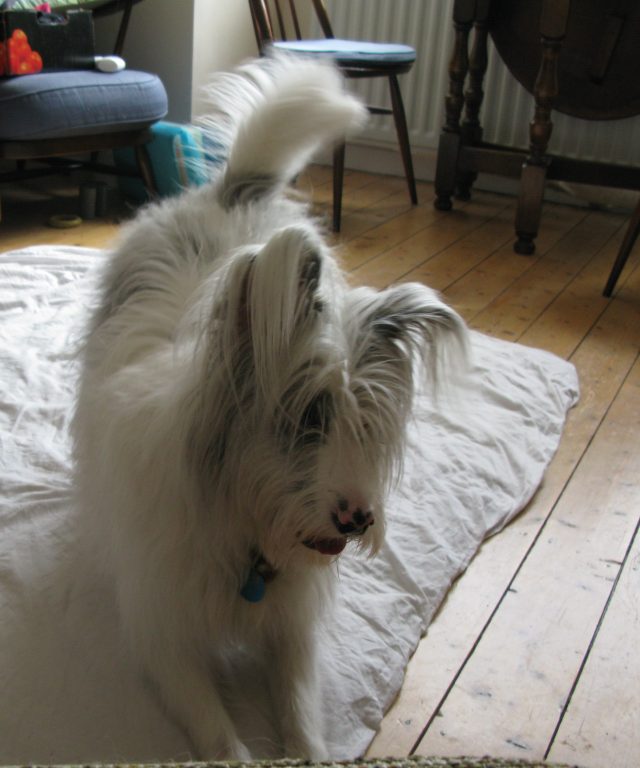 Because I’ve had one arm out of action for the last few weeks, we haven’t been able to play our silly ‘putting the collar on chase’ in the morning. Instead, the dear little creature stands perfectly still under the door handle on which her collar hangs overnight, and waits until it is clipped on, wagging her tail happily.