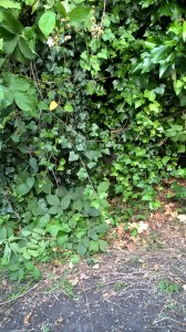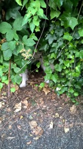 The den is a few feet back from the track and I have to pull thick strands of ivy aside before I can locate her.