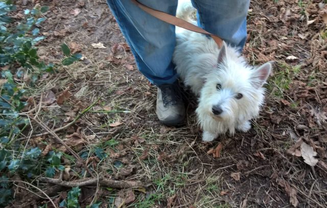 She is not, of course, afraid of dogs she knows well, like Nancy and Rufus, Bertie and George. She does take a few steps back when the former pair greet her by shoving their snouts into her face, but she knows they’ll not do anything nasty to her. They have always been very tolerant of her barging into them, and she happily walks alongside them when off her lead on the woodland walk in Highbury.