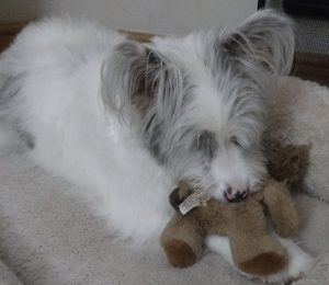 The last two days have been even better: I’ve responded to the opening woof by rocking the feeder briefly, then adding the gentle poke, and that’s been that. And twice, I’ve not had to intervene at all, instead, have just stood still enjoying the blissful sound of contented chomping, followed by claws rattling their way towards her bed where she relaxes and settles with her toys.