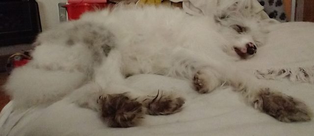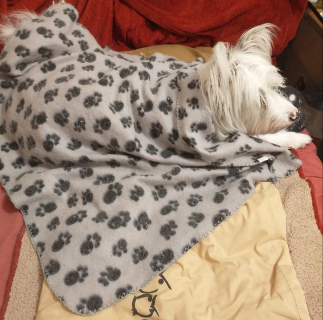 Silly person! She forgets I have a lovely, thick warm uncoat underneath all my long hair, but it makes her happy to cover me up, so I just let her get on with it, then toss the covers off when she’s gone.