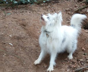 Then, at last, came the day when she would stand with me on the edge of a small group as long as no two legged or four legged beings were too close. Eventually, she walked along with our group – shadows permitting – always on the outside, but no longer terrified. Gr. and B. even persuaded her to take a treat from them.