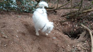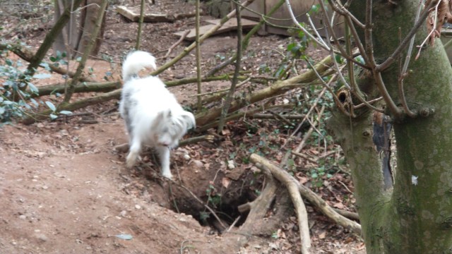 Today she sniffs, apparently innocently, at the bottom of a vast heap of prunings. I blink and she’s gone. This is ridiculous, I tell myself, scanning the surrounding woodland. Literally less than thirty seconds ago, she was at my feet, now there’s no sign of her.