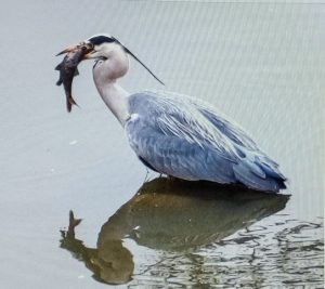 The heron is now seriously ready to hunt. We are surprised as we know that the fish have been relocated to the smaller lakes. We have just told the heron that he’ll be lucky if he finds a tiddler, when he stiffens into dive mode.