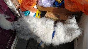 I’m glad we do because next day there’s rain and sleet and my Hairy One is very, very happy.
